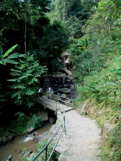 继续向上走,沿着流水向上不远,则是第二级野蕉林瀑布,这里四周遍布野蕉林,虽然洪水过后,野蕉林已被大量冲走,但现在新的野蕉树已经长出来,以后,有可能将是另一种景观。第三个是老龟潭瀑布,因瀑布下的水潭中有一怪石形如老龟而得名,这里潭水清澈冰凉,怪石奇特,黑石的石头上是清澈山泉,看上去就精神大振。 |